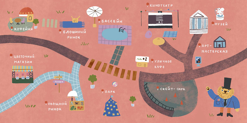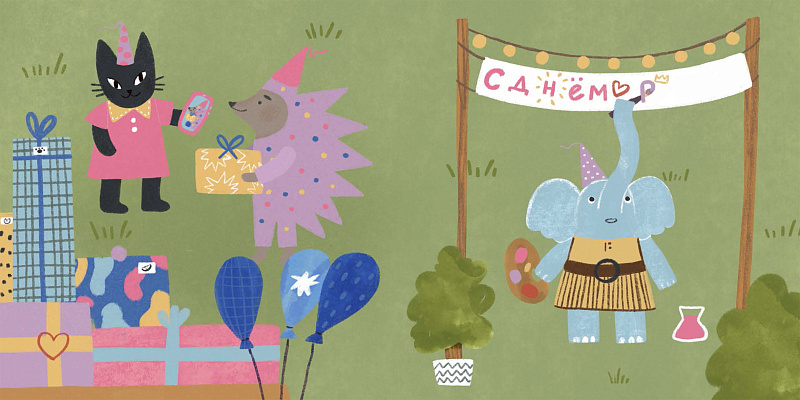 Этот маленький виммельбух – приглашение прогуляться по городу Зверинограду в выходной. Его обитатели заняты тем же, чем и жители любого другого города. Они ходят на рынок, в кафе, в бассейн и на каток, открывают выставки и устраивают премьеры фильмов. И, конечно же, празднуют дни рождения. Книга открывается разворотом с  планом города, и для маленького читателя это первый опыт соотнесения действительности с картинкой. А потом читатель может рассмотреть отдельные локации. На каждом развороте появляются новые персонажи, они вступают во взаимодействие друг с другом, а в конце собираются на день рождения. Можно проследить, чем каждый из них занимался в выходной и найти всех героев в праздничной толпе на последнем развороте.