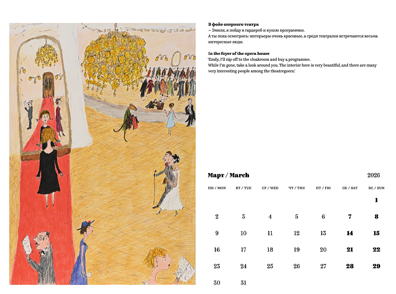 В календаре представлены страницы из иллюстрированной книги о дружбе и приключениях юной Эмили Холидей и ученого-антрополога из Австралии Сэмюэля Маккуори. Книга будет издана в 2026 году.