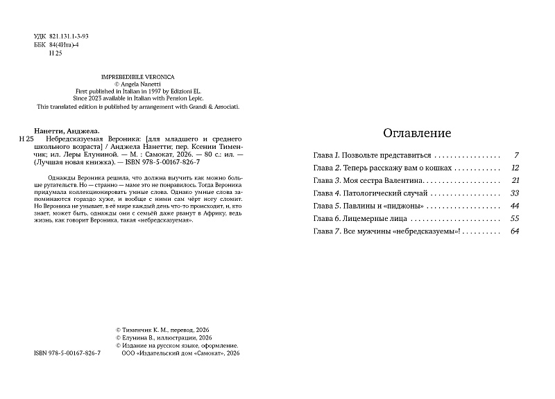 Однажды Вероника решила, что должна выучить как можно больше ругательств. Но — странно — маме это не понравилось. Тогда Вероника придумала коллекционировать умные слова. Однако умные слова запоминаются гораздо хуже, и вообще с ними сам чёрт ногу сломит. Но Вероника не унывает, в её мире каждый день что-то происходит, и, кто знает, может быть, однажды они с семьёй даже рванут в Африку, ведь жизнь, как говорит Вероника, такая «небредсказуемая».