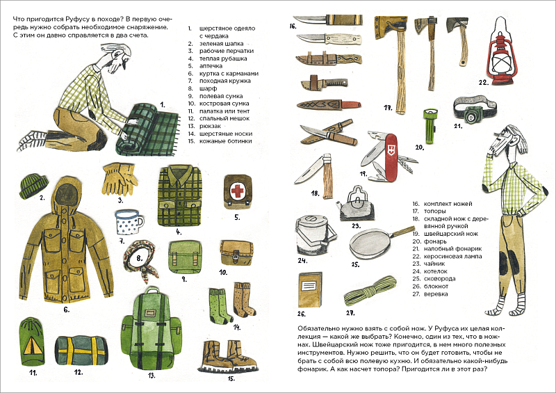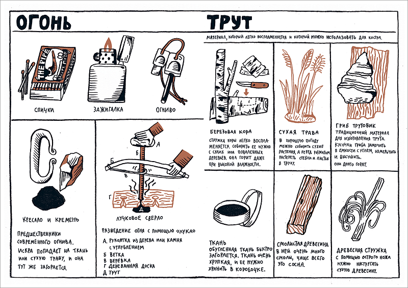 - Инструкция по разведению костра и список необходимых в лесу вещей.