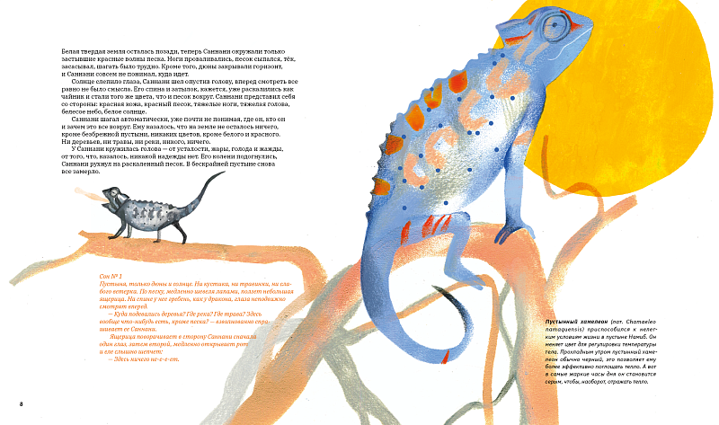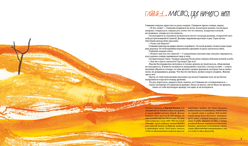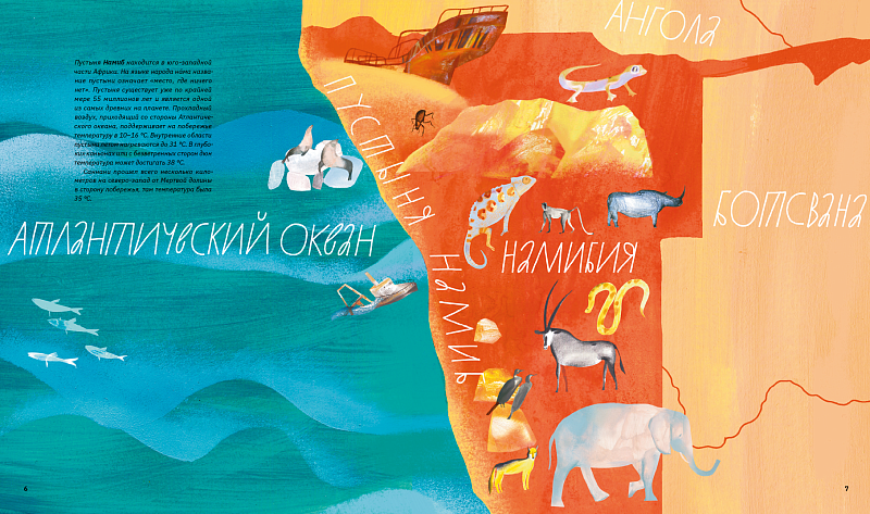Вместе с героем читатель встретит рассвет в холодной пустыне, найдет воду в русле реки, наполняющейся только в сезон дождей, окажется на вершине «горящей горы», познакомится с черным носорогом, капским морским котиком и другими обитателями берегов Намибии.