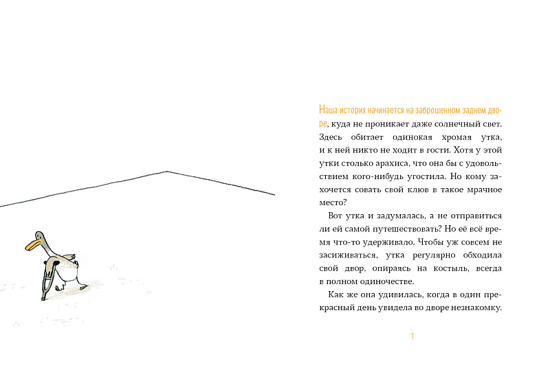 На заднем дворе, куда не проникает солнце, живёт одинокая хромая утка. Ей даже не с кем поделиться арахисом, которого у неё полным-полно! За пределы двора утка никогда не выходила — без костыля далеко не уйти, да и страшно покинуть привычное место, шагнуть в неизвестность и изменить свою жизнь.