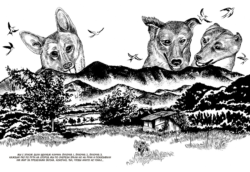В «Собаках» Ким-Жандри Кымсук разоблачает жестокость своих, казалось бы, цивилизованных соотечественников, выступает против насилия над животными и показывает волшебство, которое происходит, когда собака растёт в любящей и заботливой семье.