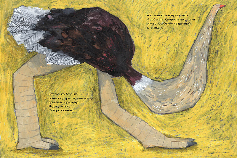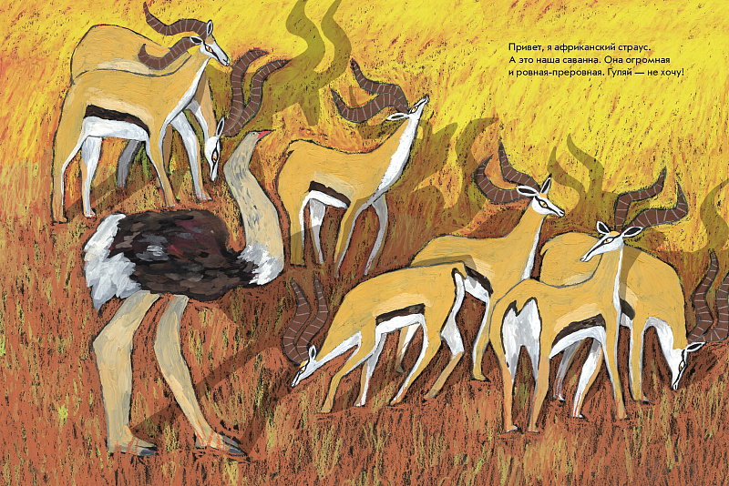 Уникальное сочетание художественной истории и научно-популярных фактов про африканского страуса и других обитателей саванны;