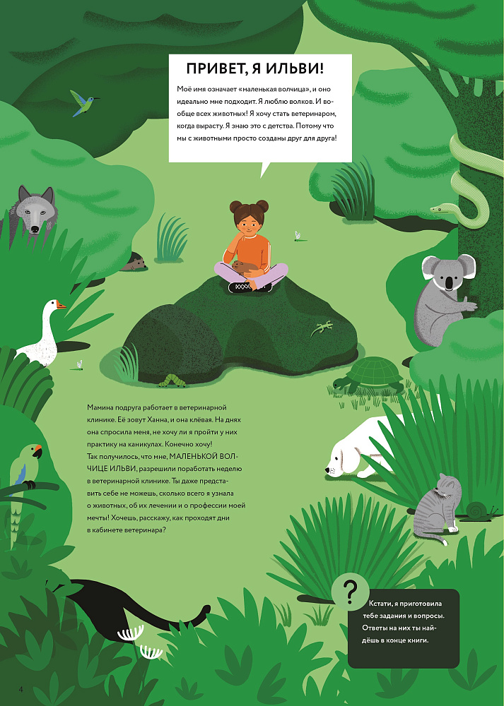 Приглашаем вас пройти недельную практику в настоящей ветеринарной клинике вместе с главной героиней книги: девочкой Ильви, мечтающей в будущем стать ветеринаром и лечить животных! Вместе с ней вы не только побываете на приёме мелких зверей и рептилий, в рентгеновском кабинете, операционной, лаборатории и объездите все фермы в округе, но и узнаете много нового и интересного о зубах и костях, о работе пищеварения и сердца, о том, какие витамины и минеральные вещества нужны домашним питомцам и животным на ферме. Вас также ждут задания, вопросы и полезные советы, как заботиться о зверях и птицах: домашних, диких и экзотических.