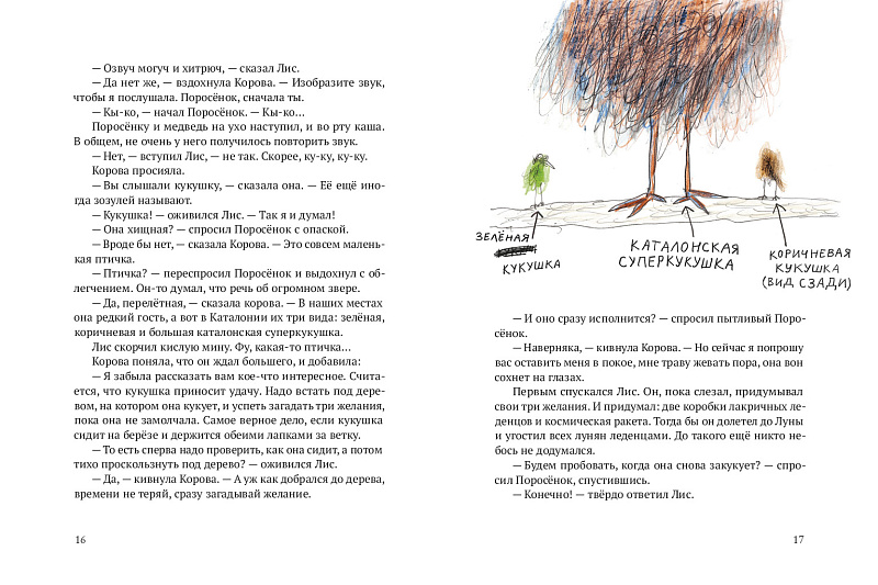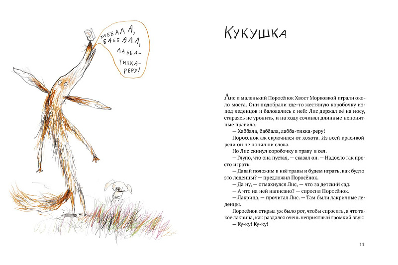 В первой книжке из серии историй о Лисе и Поросёнке мы знакомимся с ними и с другими удивительными персонажами. А кажется, что мы знакомы уже давно: с места в карьер, с первой же страницы, мы отправляемся с героями на поиски кукушки, которая исполняет любые желания, скачем верхом на королевской плюгавой, спасаем урожай редиски от вредной акулиски — грозы огородов, ищем драгоценные лисумруды и поросяхонты и притворяемся французским зелёным жаворонком, чтобы раздобыть йогурт с дыней.