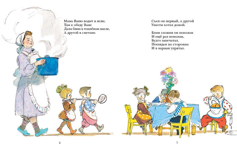 Художники Анатолий Елисеев и Михаил Скобелев нарисовали выразительные иллюстрации со смешными подробностями. Малыши будут с удовольствием рассматривать хозяйственного Ваню с необъятным карманом, в котором странным образом уместились и рогатая корова, и жираф, и юла, и пирамидка, и множество других заманчивых предметов. Хороша для рассматривания и жизнь детского сада: повариха с кастрюлей, детки в фартучках с поварёшкой, прогулка на детской площадке, коллективный поиск исчезнувшего барабана и т.д.