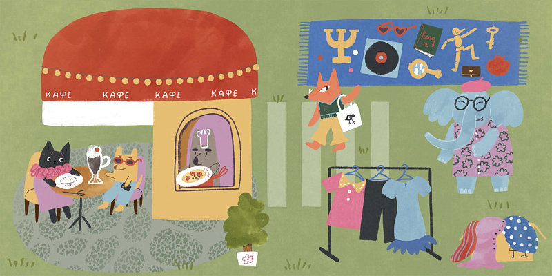 Этот маленький виммельбух – приглашение прогуляться по городу Зверинограду в выходной. Его обитатели заняты тем же, чем и жители любого другого города. Они ходят на рынок, в кафе, в бассейн и на каток, открывают выставки и устраивают премьеры фильмов. И, конечно же, празднуют дни рождения. Книга открывается разворотом с  планом города, и для маленького читателя это первый опыт соотнесения действительности с картинкой. А потом читатель может рассмотреть отдельные локации. На каждом развороте появляются новые персонажи, они вступают во взаимодействие друг с другом, а в конце собираются на день рождения. Можно проследить, чем каждый из них занимался в выходной и найти всех героев в праздничной толпе на последнем развороте.