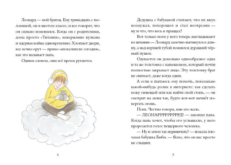 Восьмилетней Леонии в школе задали вести дневник наблюдений за животным. У всех в классе кто-нибудь есть: попугаи, кролики, песчанки. И только у Леонии, как назло, ни кошки, ни собаки, ни даже хомячка. Зато у Леонии есть старший брат Леонард. Подросток Леонард — представитель вида homo sapiens — тоже животное, как и мы все. Почему бы не понаблюдать за ним? Поведение, питание, среда обитания и миграции Леонарда — все становится предметом исследования сестры.