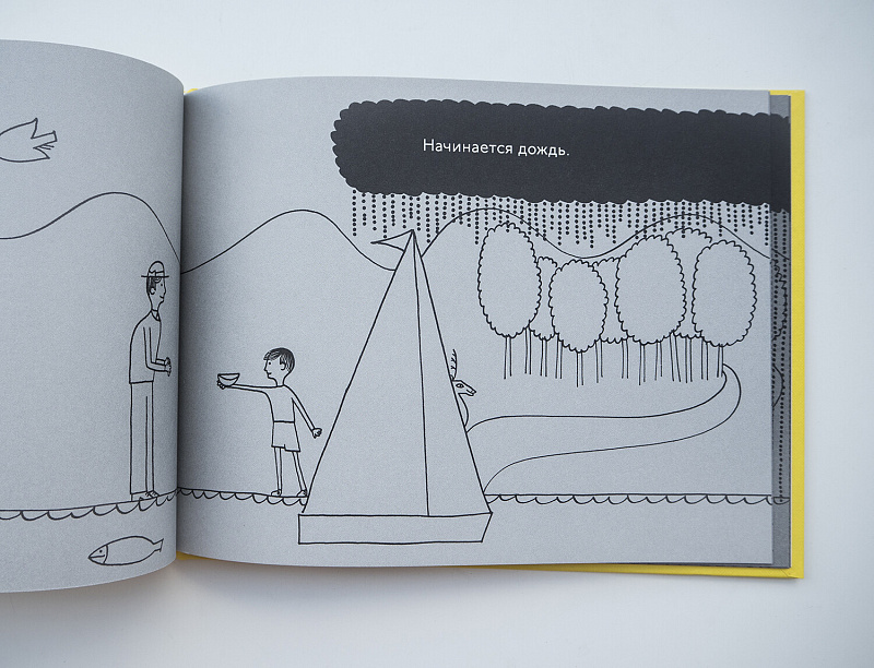 Впервые опубликованная в 1957 году в США, эта книга напоминает диафильм. Переворачивая каждую следующую страницу, читатель все еще остается посреди созданного Реми Чарлипом прекрасного и минималистичного пейзажа. Меняются лишь его элементы — деревья, дом, олень и лодка. Но внезапно начинается дождь и все куда-то исчезает.