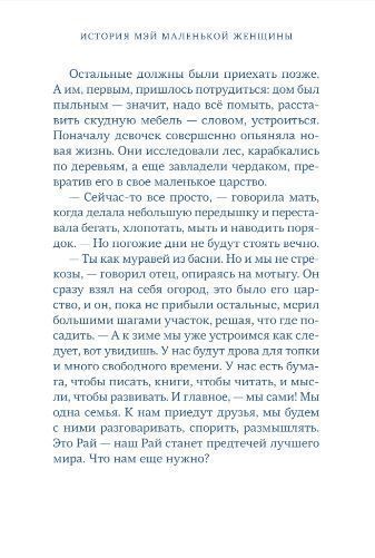 Мэй еще ребенок, но она уже знает, каково это, когда все в твоей жизни вдруг поменялось. Ее семья переезжает из городка Конкорд в Рай — место, где родители Мэй хотят построить идеальную коммуну. Там не едят мяса, не эксплуатируют животных (даже пчел!) и носят самую простую одежду из льна. И хотя в новой жизни есть место и дружбе — с индейской девочкой по имени Две Луны, и первой влюбленности — в Прекрасного Господина, и приключениям, но все-таки эту новую жизнь Мэй не выбирала. И единственный способ принять перемены — это взять в руки бумагу и перо и воссоздать реальность вокруг себя — в письмах подруге Марте, оставшейся в городе. У Мэй невероятное воображение, и в своих письмах она будто живет в разных реальностях, переосмысливает свое прошлое и придумывает будущие, еще не испытанные приключения. И понимает, что, как и в природе, в жизни все меняется, и движение является неотъемлемой частью жизни.