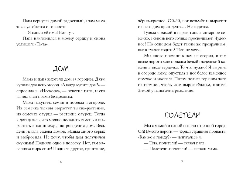 Мама накупила семян и посеяла в огороде. Из семечка тыквы вырастет тыква-растение, из семечка огурца — растение огурец. Тогда я догадалась, что можно посадить камень и вырастить к папиному дню рождения дом. Весь день искала семена домов. Нашла много серых и выбросила. Не хочу, чтобы дом получился скучным! Подняла одно в полоску. Нет, там наверняка цирк спит! Подняла другое, гранитное, чёрно-красное. Ой-ёй, вот возьмёт и вырастет из него дом президента… Не годится.