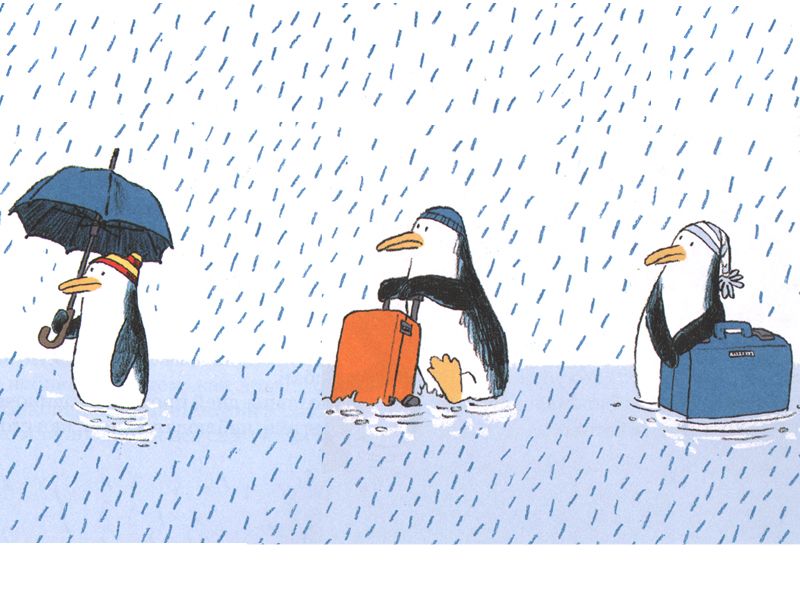 Пока они препираются по этим вопросам, начинается дождь, а за ним и Всемирный потоп! Конечно, Бог велел Ною: «Построй огромный Ковчег и возьми на него от каждой твари по паре», а Голубка принесла пингвинам пару билетов. Но их-то трое!