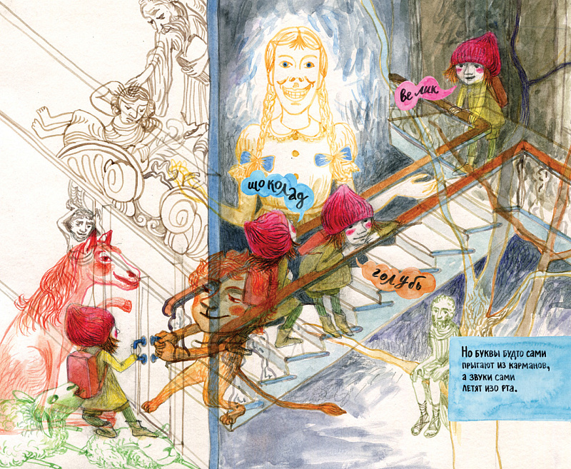 Элен и Варваре и правда удалась в полном смысле слова необыкновенная история, в которой герои за несколько страниц переживают настоящее перерождение, а их мир, еще совсем недавно серый и будничный, вдруг расцветает всеми цветами радуги — и все благодаря буквам! Здесь нет ничего случайного, ничего лишнего: каждая буква, каждый звук играет свою неповторимую роль. Великолепный пример того, как текст и изображение не просто дополняют друг друга, а переплетаются в единую художественную ткань, где одно неотделимо от другого.
