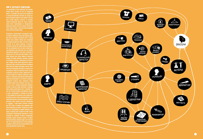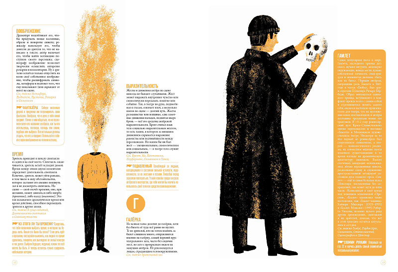 Безупречный с точки зрения эстетики словарь, он же пособие — энциклопедия — рабочая тетрадь, на страницах которого — история театра в терминах от А до Я. Нескучный, а порой даже хулиганский справочник расскажет, как современный театр объединил в себе литературу, музыку, архитектуру, танец, изобразительное искусство и даже кино. Португальские авторы дают ответы на любые вопросы: чем виноваты древние греки и каким бывает занавес, из кого состоит театральная команда, что таит в себе словосочетание «русские сезоны» и кто же такие рассерженные молодые люди? Есть в тетради и множество мастер-классов — например, по изготовлению черепа бедного Йорика из папье-маше.