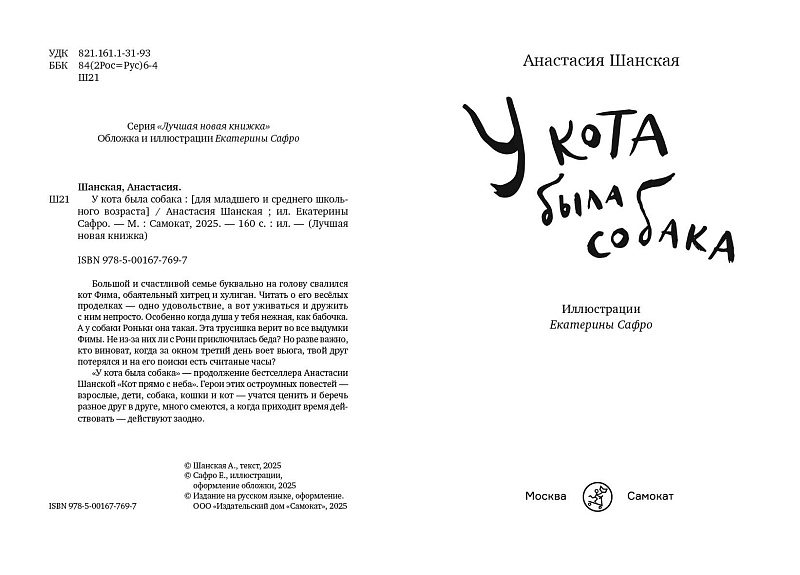 «У кота была собака» — продолжение бестселлера Анастасии Шанской «Кот прямо с неба» про хвостатого, который буквально свалился на голову одному милому семейству. В этой душевной, остроумной, уморительно-смешной повести Фима учится ценить и беречь тех, у кого душа — бабочка.