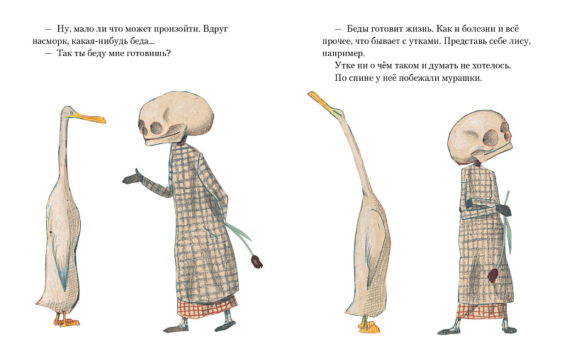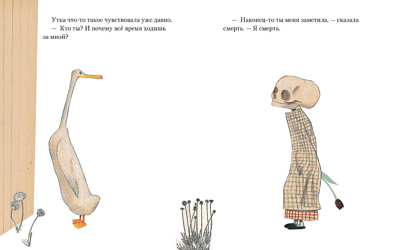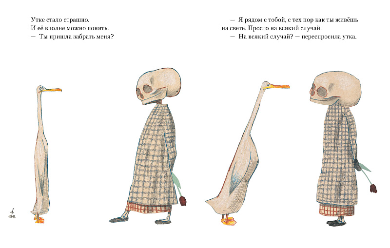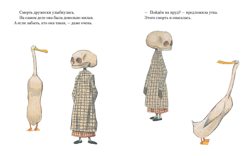 Вольф Эрльбрух очень не любит, когда в детских книжках рисуют персонажей похожими на симпатичных диснеевских мультяшек. Смерть в его книге, как и положено смерти, изображена в виде скелета. А чтобы сделать её более дружелюбной (ты ведь заметил, как приветливо смерть беседует с уткой?), он просто её…одел.